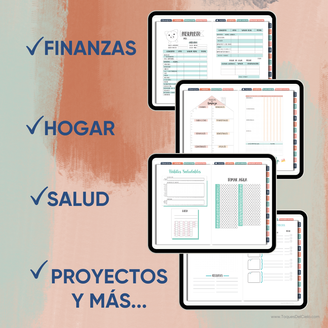 - Finanzas: Presupuesto, Flujo de caja, Control de gastos, Pago de facturas y Pago de deudas.